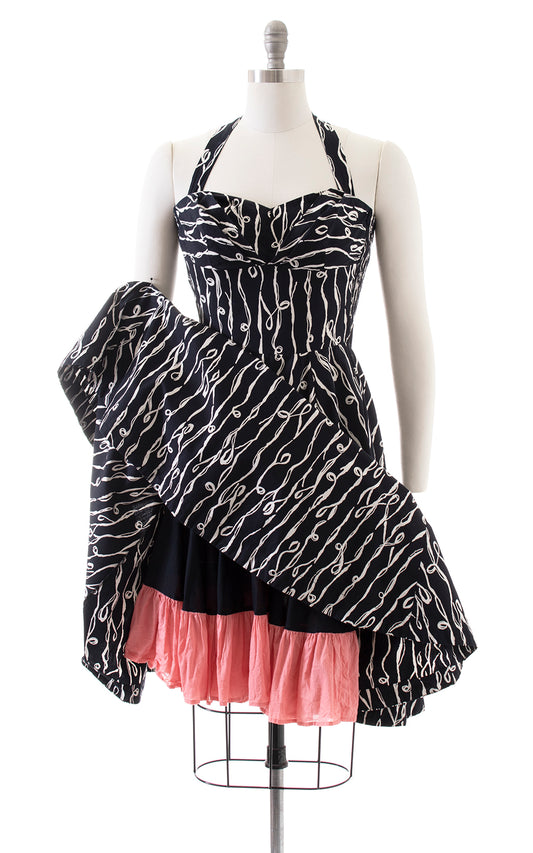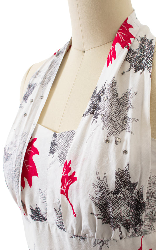 1950s Rhinestones & Leaf Print Cotton Halter Sundress | small