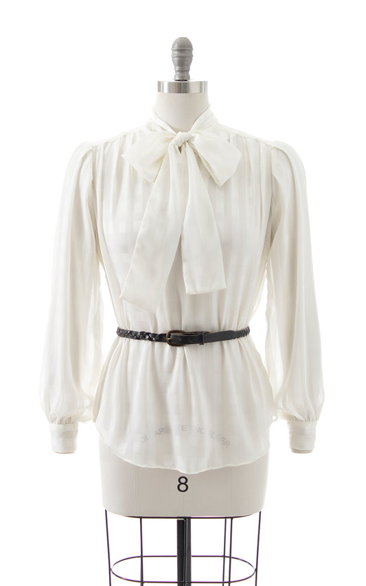1980s Sheer Silky White Pussy Bow Blouse | medium/large