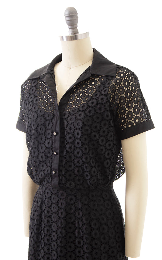 1950s Black Cotton Eyelet Shirtwaist Sheath Dress | small