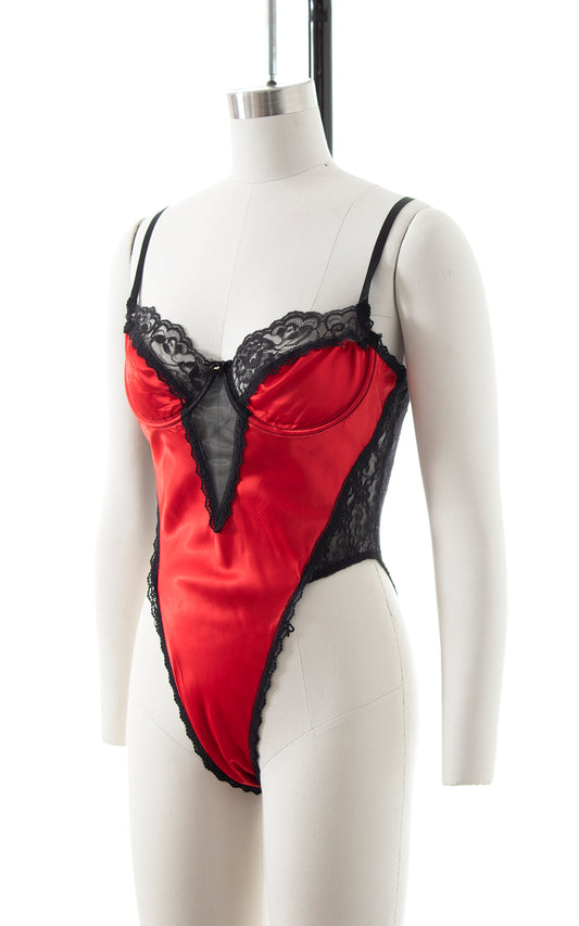 1980s Red Satin & Black Lace High Cut Bodysuit | x-small/small