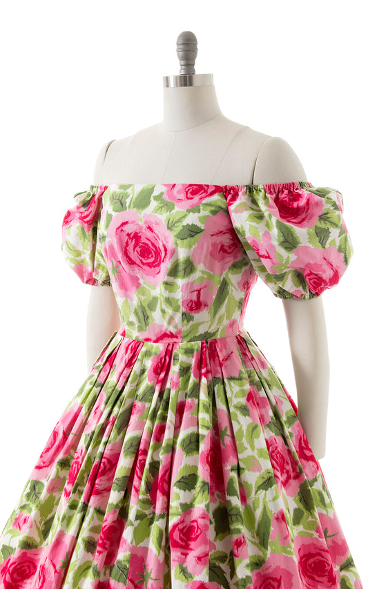 1950s Rose Cotton Puff Sleeve Dress | small/medium
