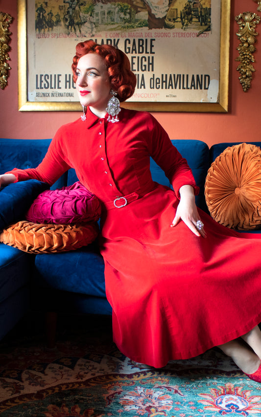 BLV x DEANNA || 1950s Red Velveteen & Rhinestones Shirt Dress | small
