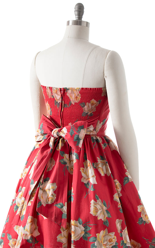 1980s Rose Smocked Strapless Circle Skirt Sundress | small/medium