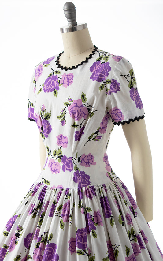 1950s Purple Rose Cotton Drop Waist Dress | x-small/small