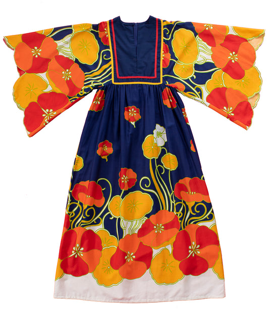 1970s Floral Border Print Drama-Mama Sleeves Maxi Dress | x-small/small