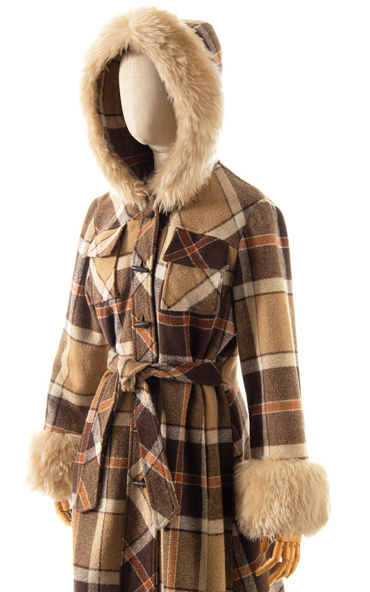 1970s Faux Fur Trim Plaid Hooded Princess Coat | small/medium