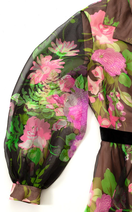 1970s Floral Fern Chiffon Balloon Sleeve Maxi Dress | medium