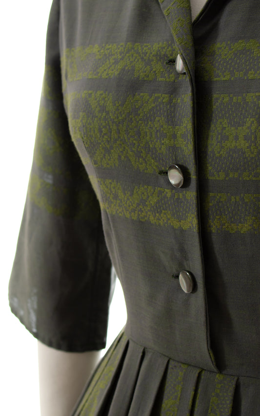 1950s Geometric Olive Shirtwaist Dress | small/medium