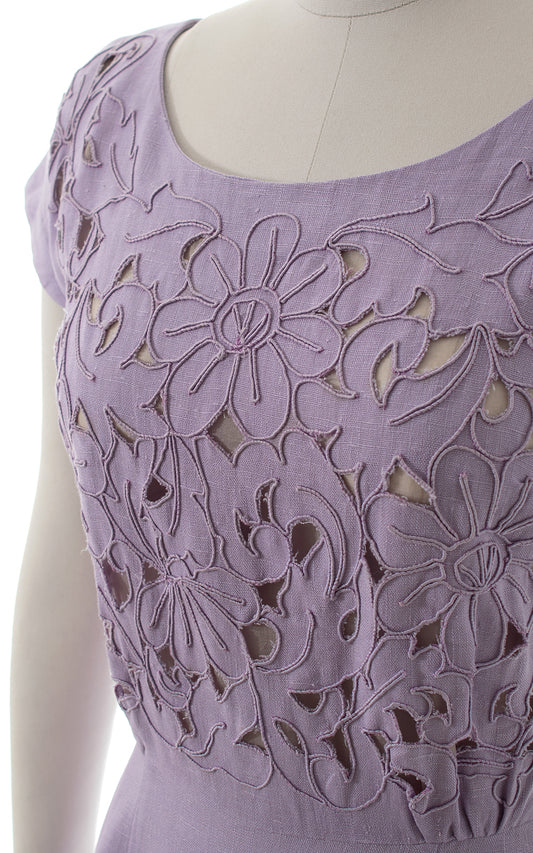 1950s Linen Floral Cutwork Wiggle Dress | medium