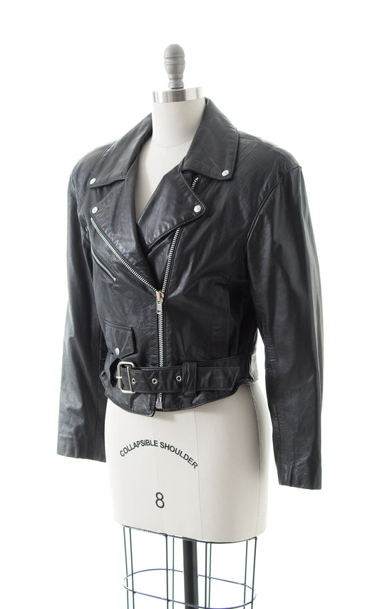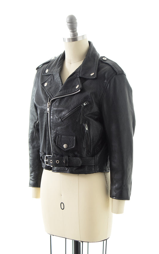 1990s Black Leather Cropped Moto Jacket | large