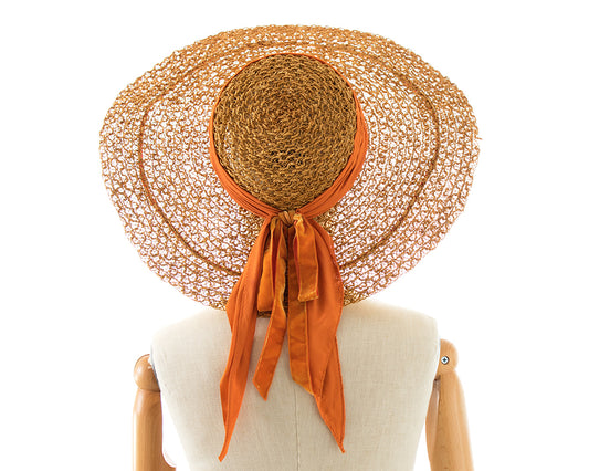 1950s Orange Ribbon & Wide Brim Wicker Sun Hat