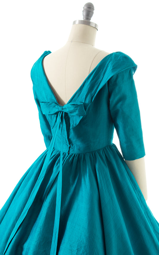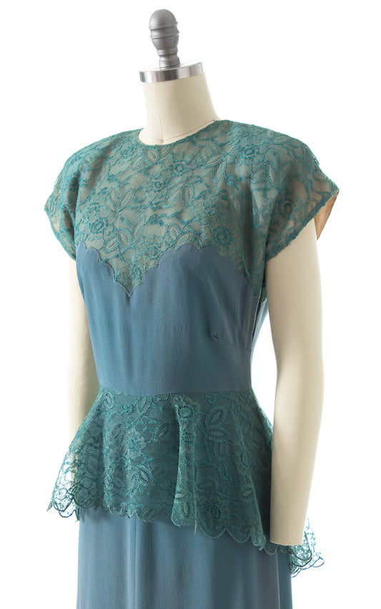 1940s Teal Rayon & Lace Peplum Cocktail Dress | small
