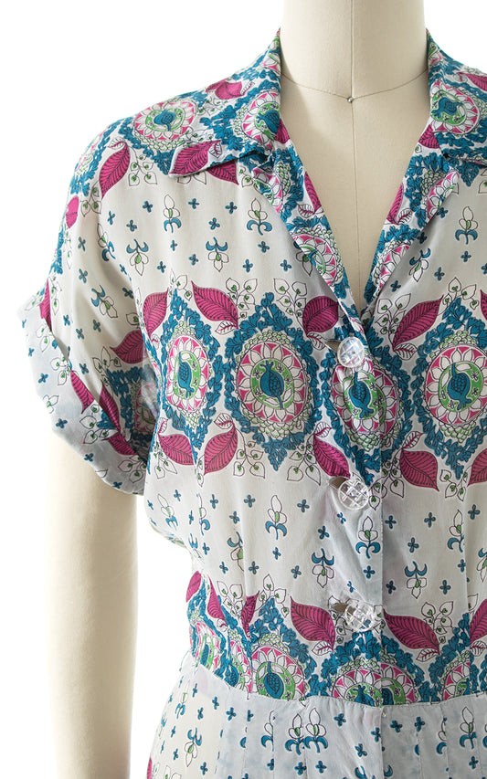 1940s Floral Striped Sheer Rayon Shirtwaist Dress | small