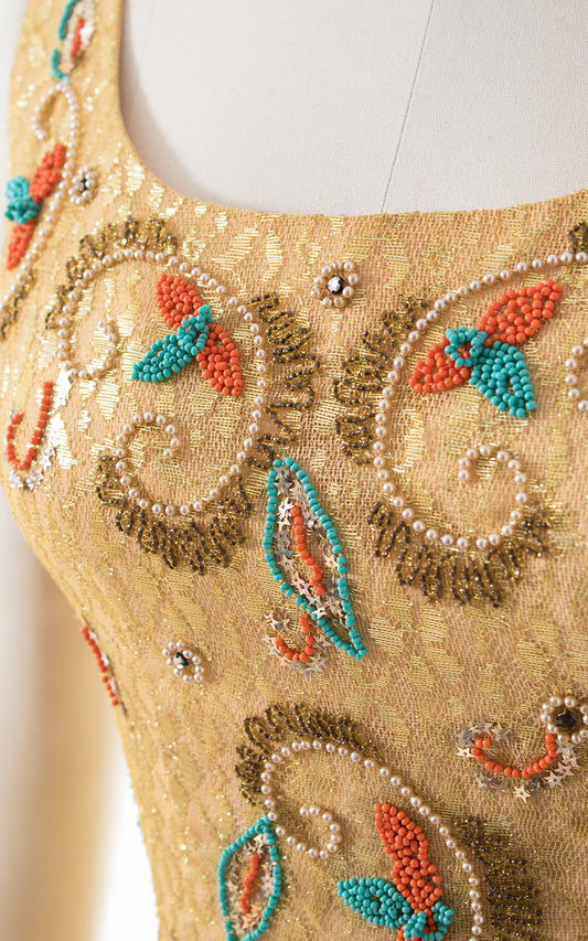 1960s Floral Beaded Sequin Gold Lace Party Dress | small