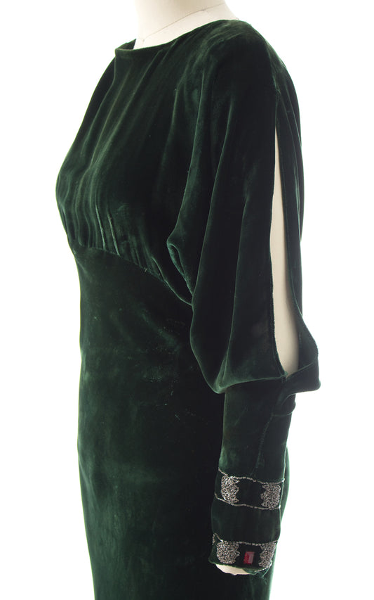 1930s Forest Green Bias Cut Velvet with Beaded Slit Sleeves Gown | x-small/small
