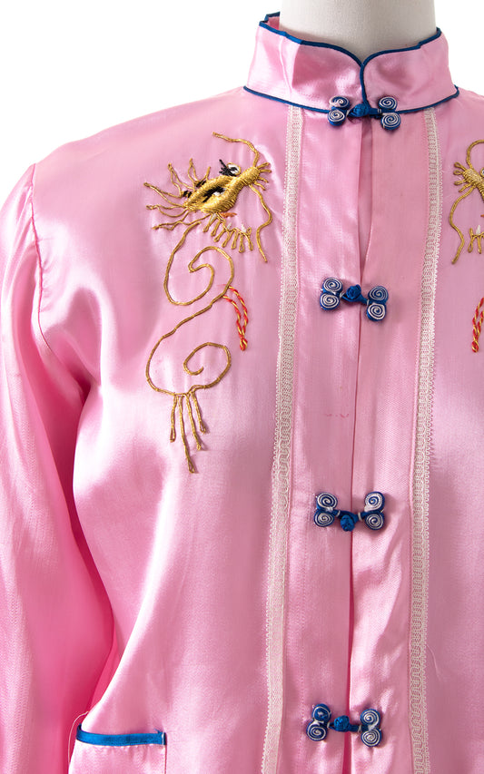 1960s Asian Dragon Embroidered Pink Satin Pajama, Robe & Slippers Set | x-small/small