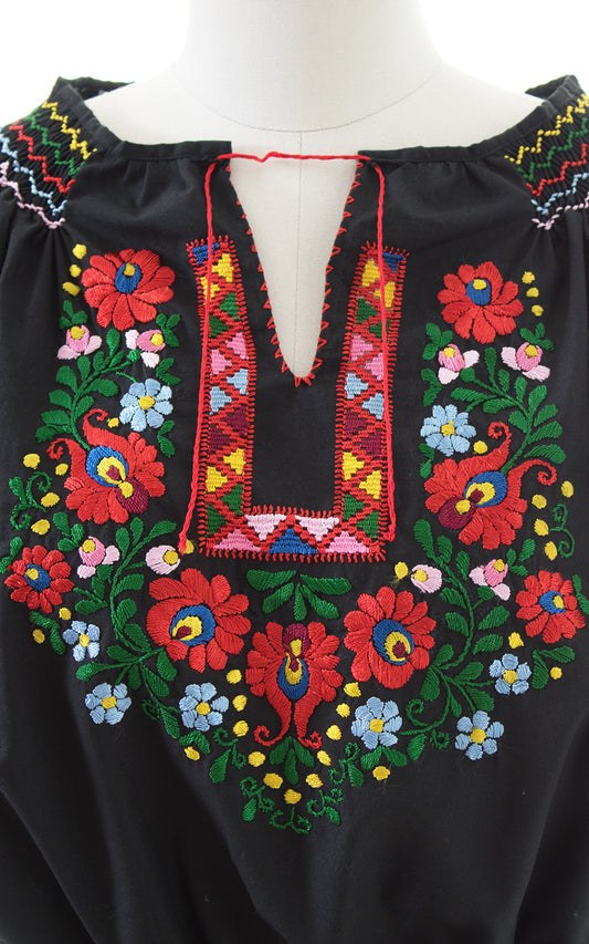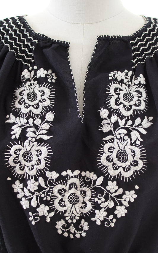 1970s Floral Embroidered Black Peasant Top | small/medium