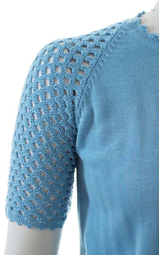 1970s Crochet Puff Sleeve Cotton Peasant Top | medium