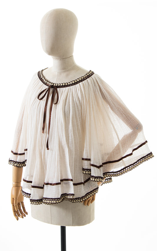 1970s Angel Sleeve Gauze Cotton Trapeze Top | xs-large