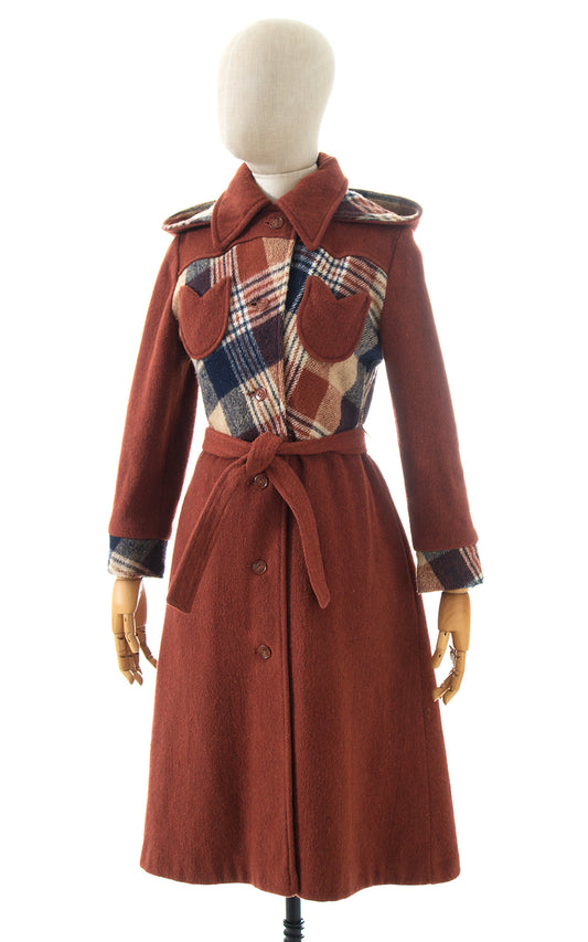 1970s Hooded Plaid Wool Princess Coat | x-small/small