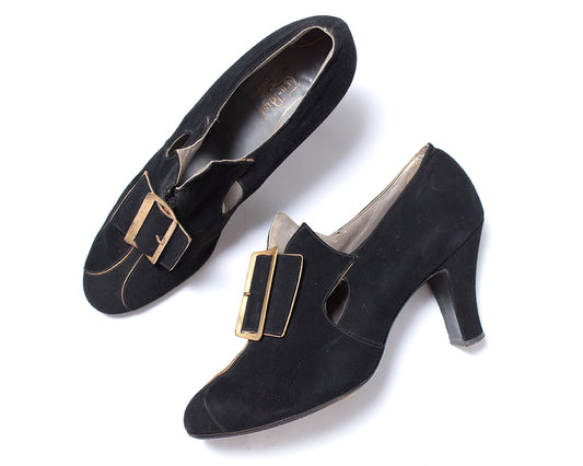 1930s Witchy Buckled Black Suede Leather Heels | size US 6.5