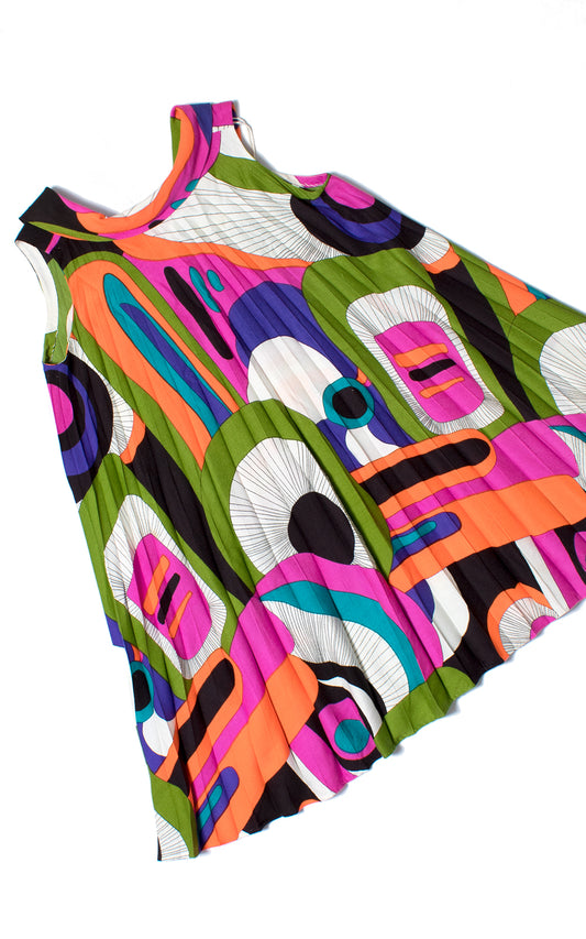 1960s Psychedelic Barkcloth Pleated Trapeze Dress | x-small/small/medium