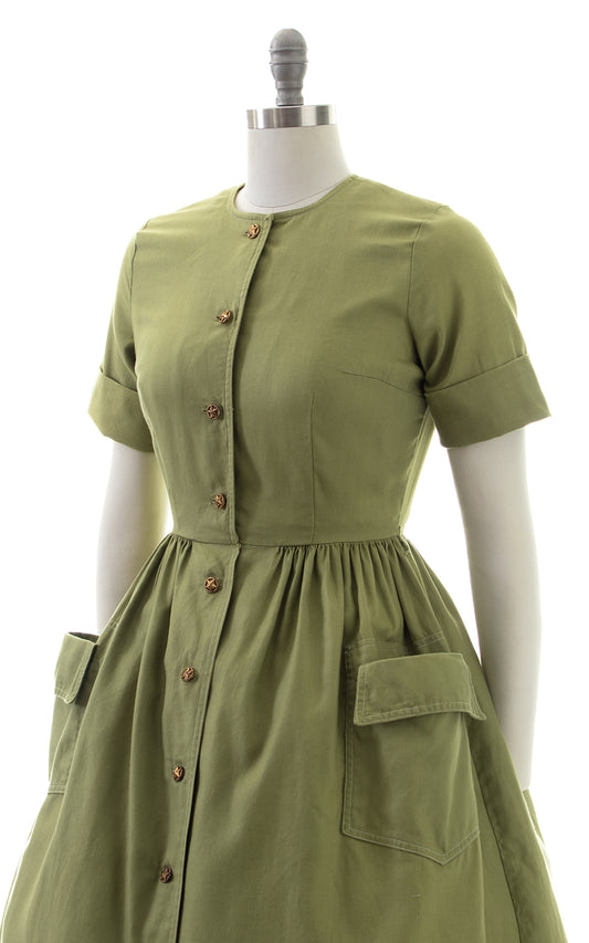 1960s Olive Green Shirtwaist Dress with Pockets | small