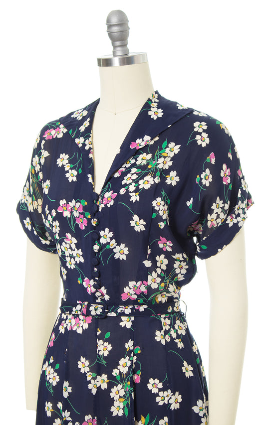 1940s Floral Navy Blue Sheer Rayon Shirtwaist Dress | small