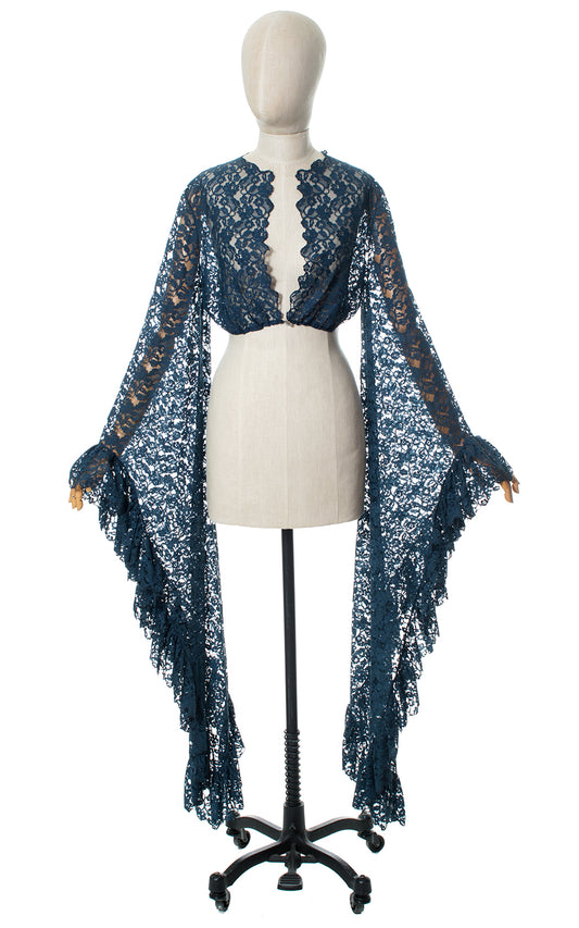 1970s Blue Lace Ruffled Angel Sleeve Top | xs/small/medium