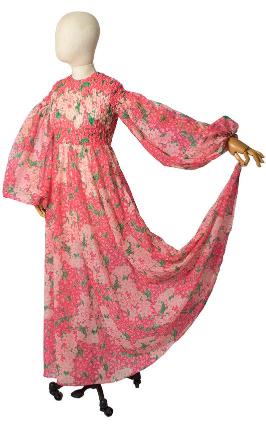 1960s Chiffon Hydrangea Floral Balloon Sleeve Maxi Gown | x-small/small/medium