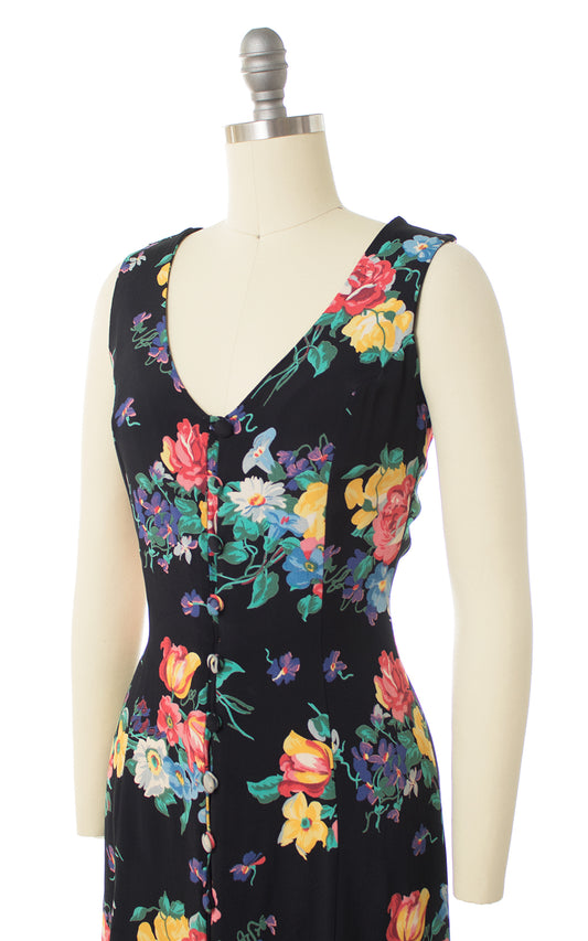 1990s Floral Rayon Crepe Button Down Midi Dress | x-small