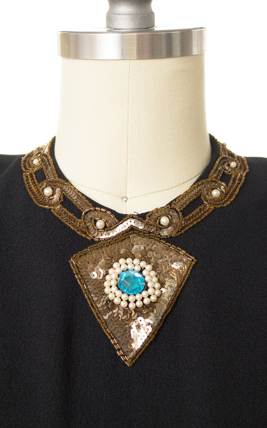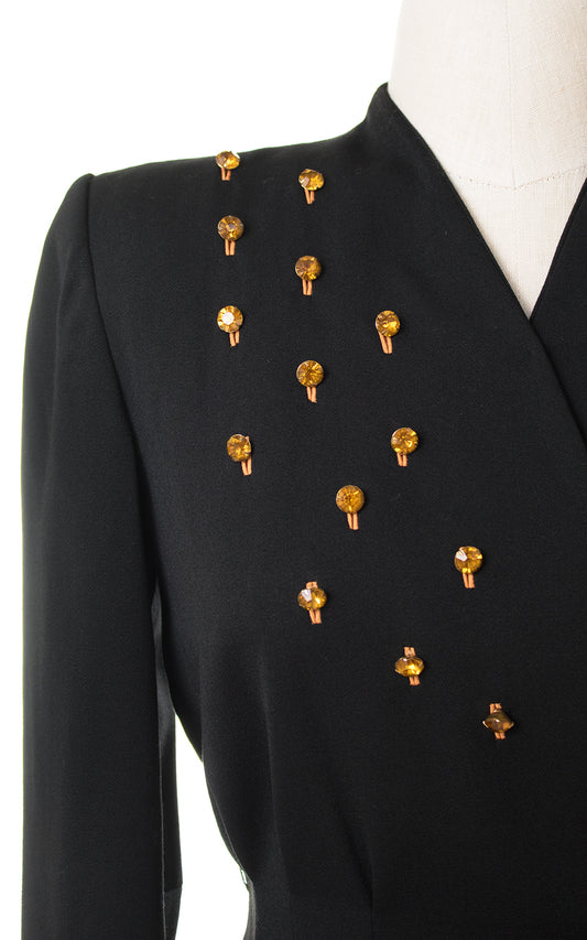 1940s Sequin Rhinestone Black Rayon Crepe Peplum Dress | small