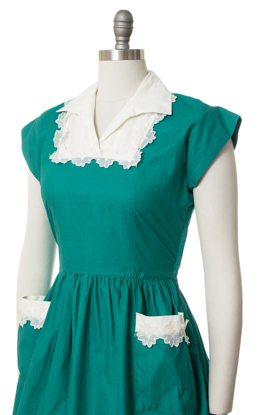 1940s Green Cotton Floral Appliqué Day Dress with Pockets | medium