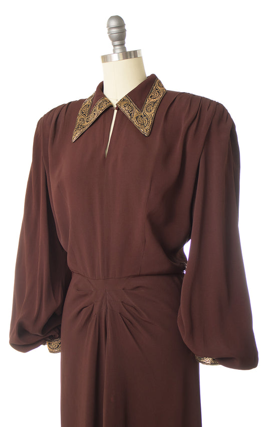 1940s Chocolate Rayon Crepe & Gold Bishop Sleeve Evening Dress | medium