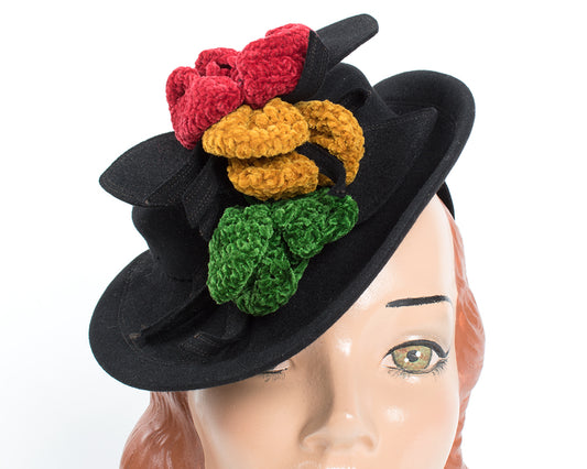1940s Tri-Color Chenille Flowers & Black Wool Tilt Hat