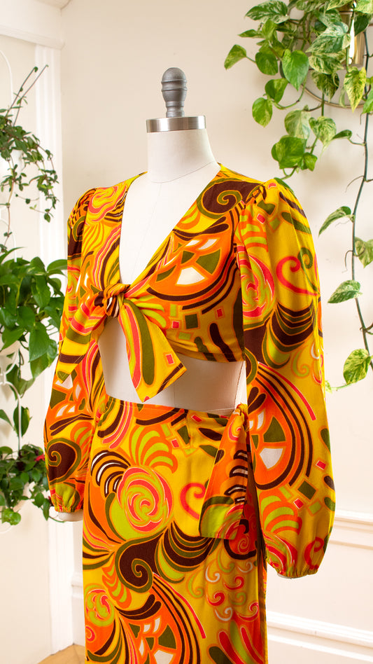 1970s Psychedelic Barkcloth Crop Top & Wrap Skirt Set | small/medium
