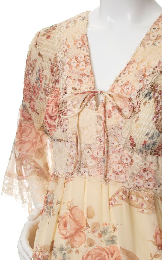 1970s Rose Printed Handkerchief Sleeve Tiered Maxi Dress | x-small/small
