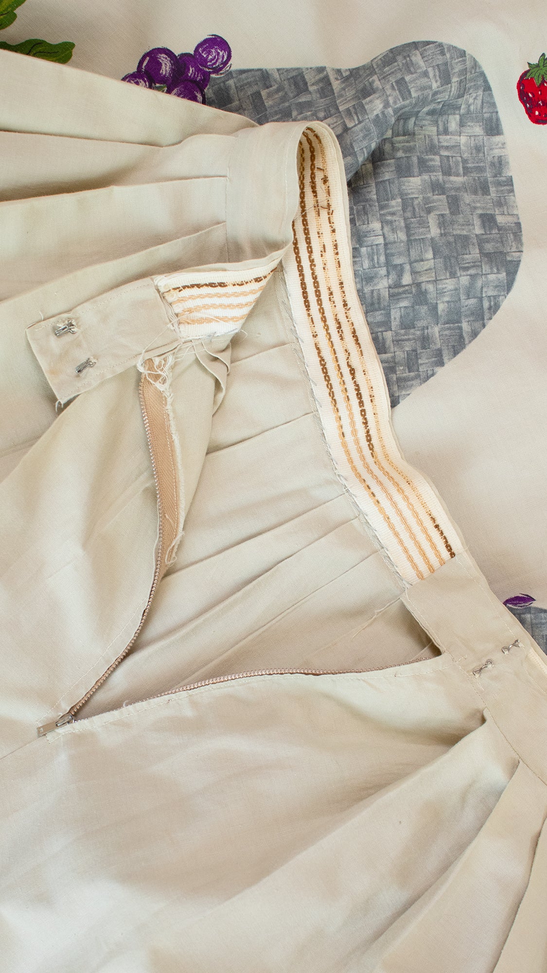 Very good vintage condition. Freshly cleaned and ready to wear! The rubberized strip on inner waistband has worn off a bit with age. A few tiny spots on inside of hem. None of these issues are visible while worn or affect the skirt's wearability.