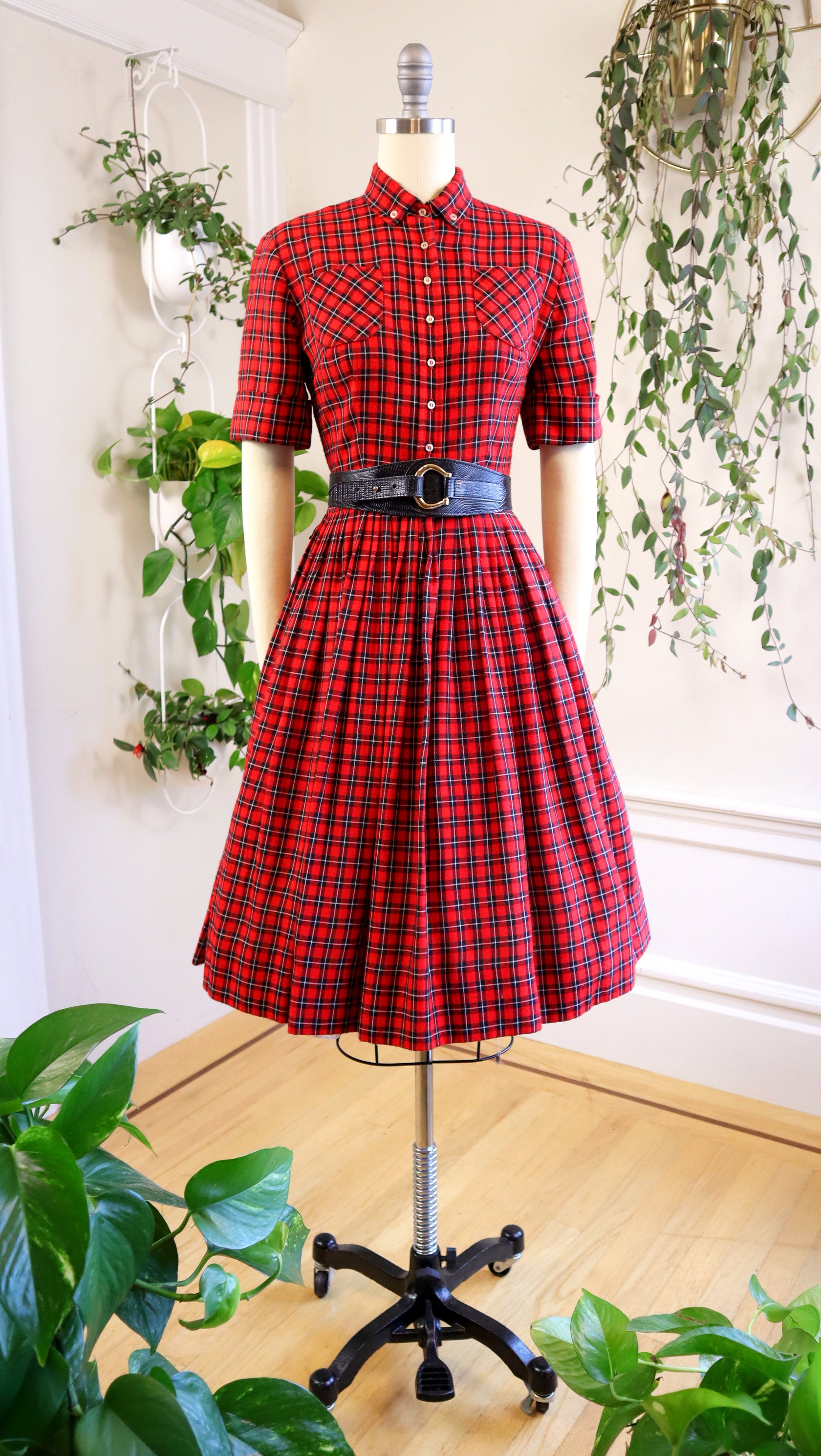 1950s Red Plaid Wool Shirtwaist Dress | small