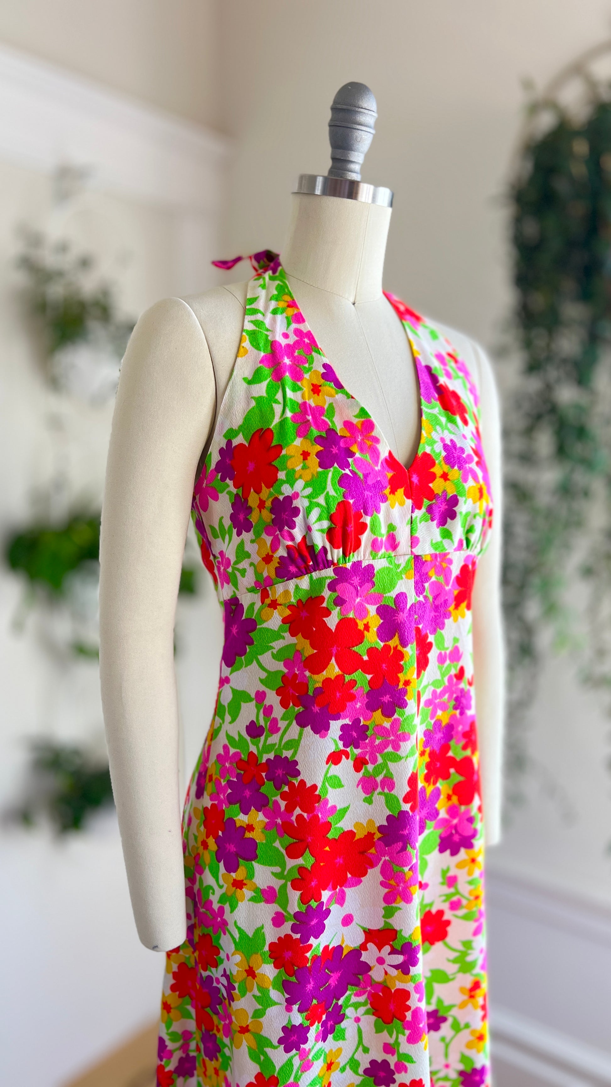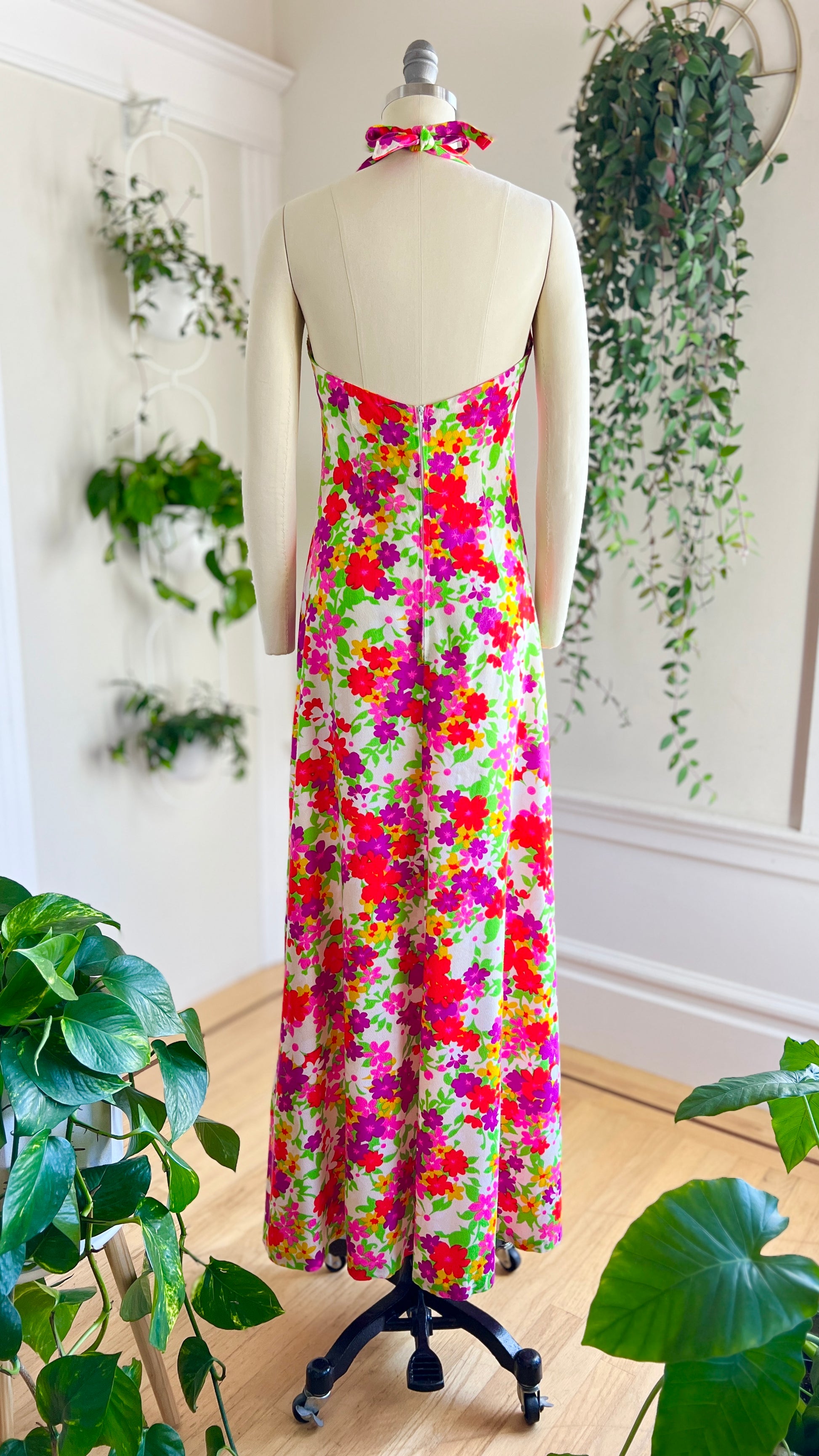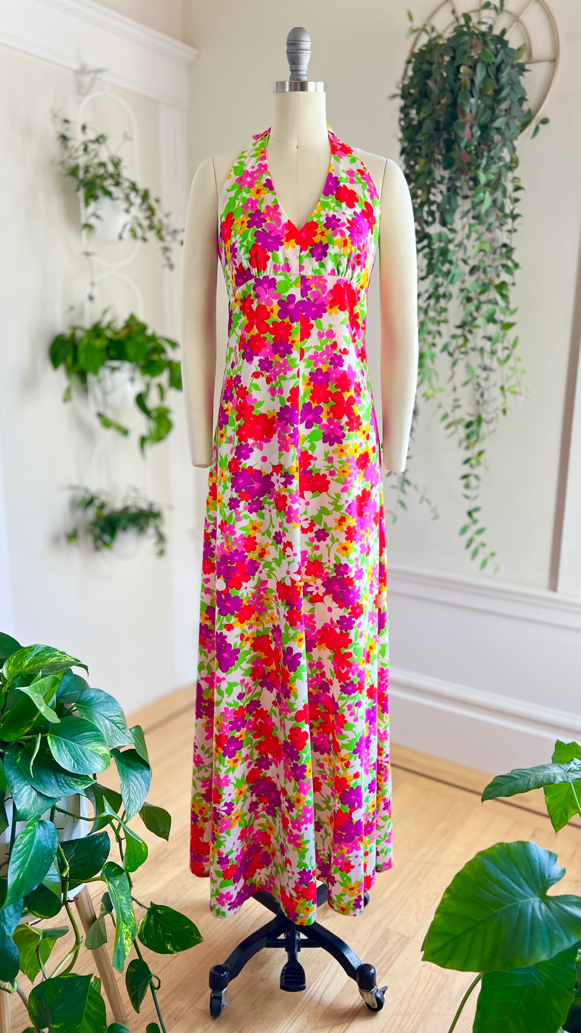 1960s 1970s Floral Halter Maxi Dress | x-small