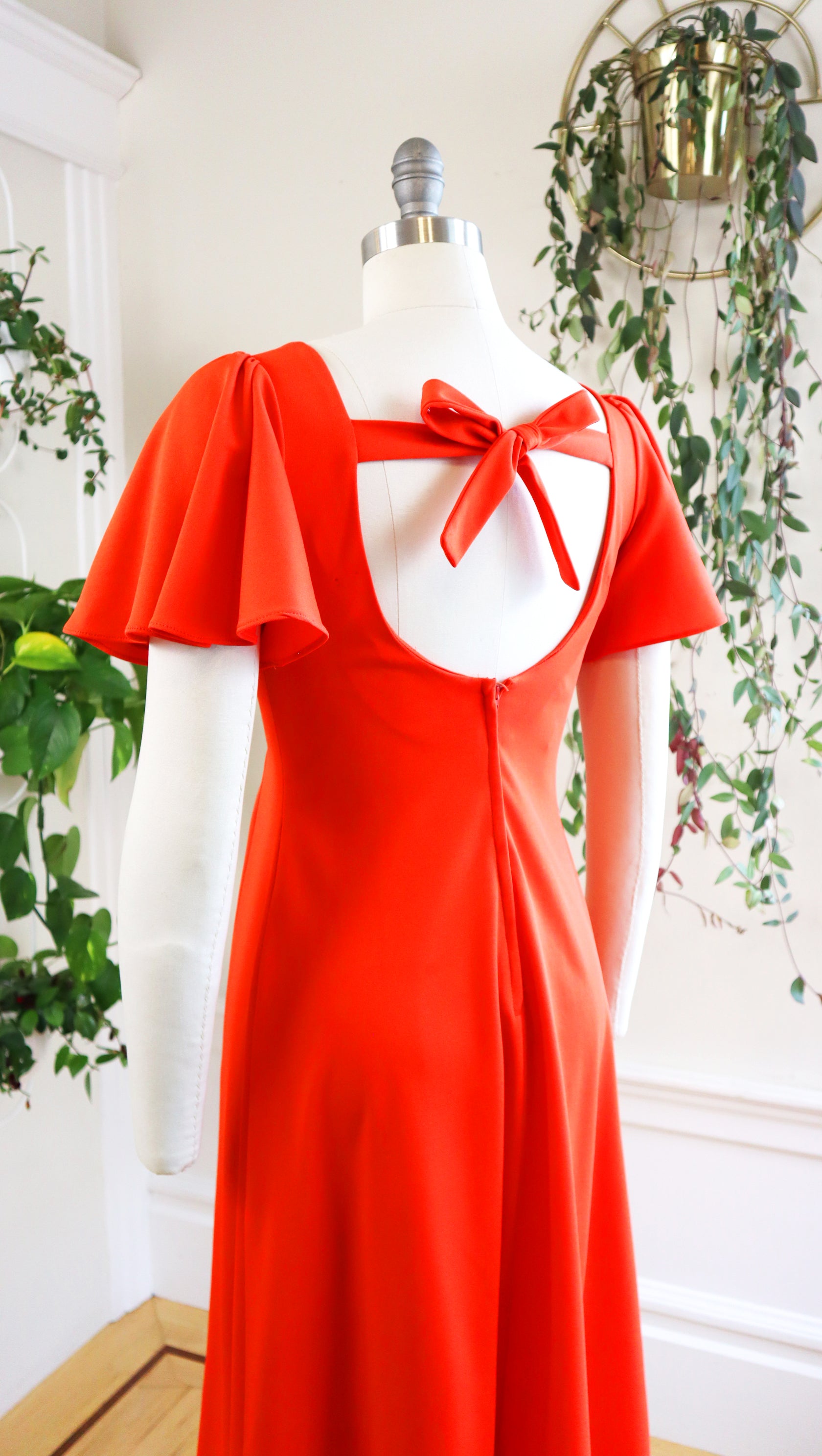 • open scoop back with criss-cross straps (attach to sides of neckline with hidden hook/eye closures; can also be tied into a bow as shown in photos)