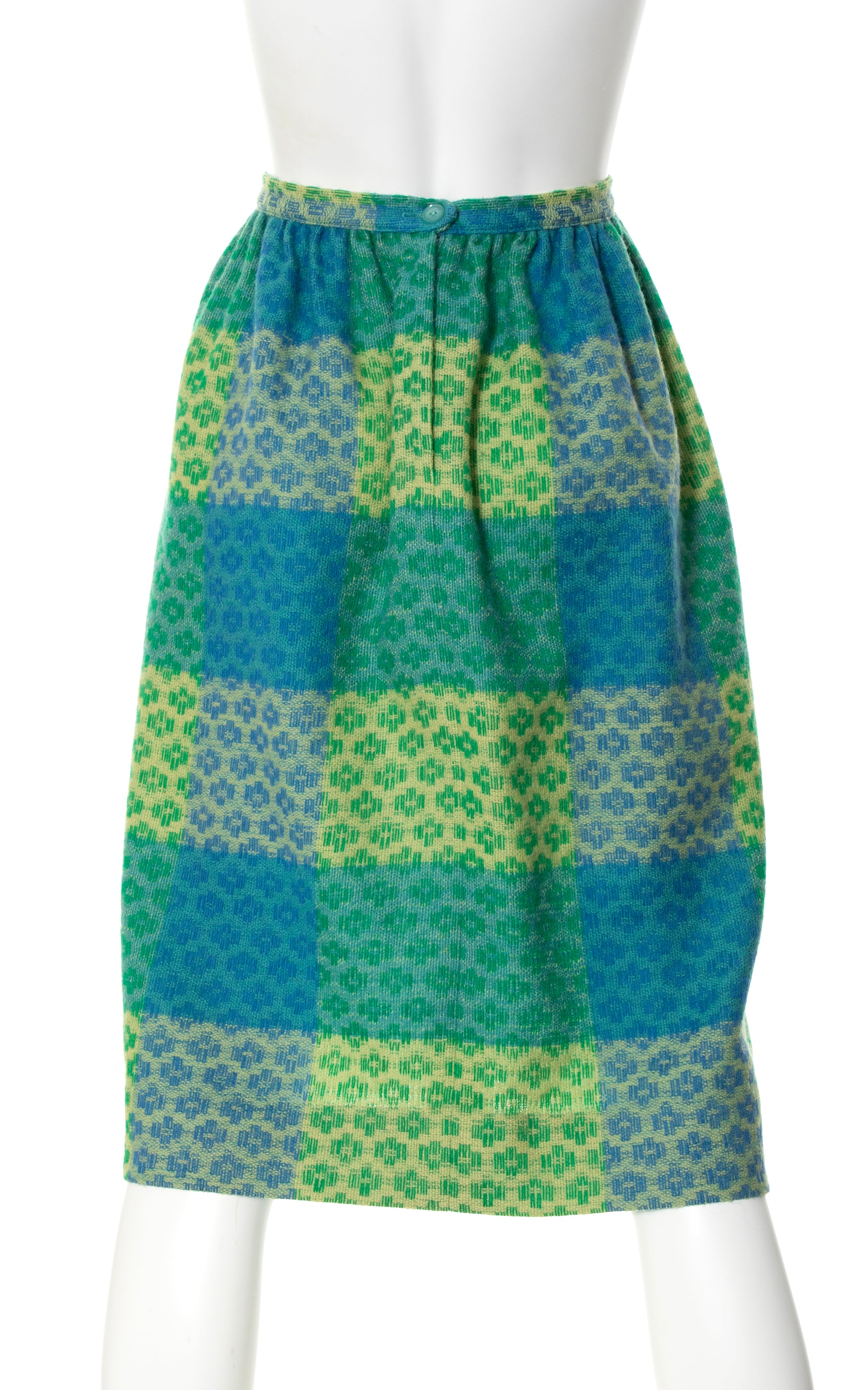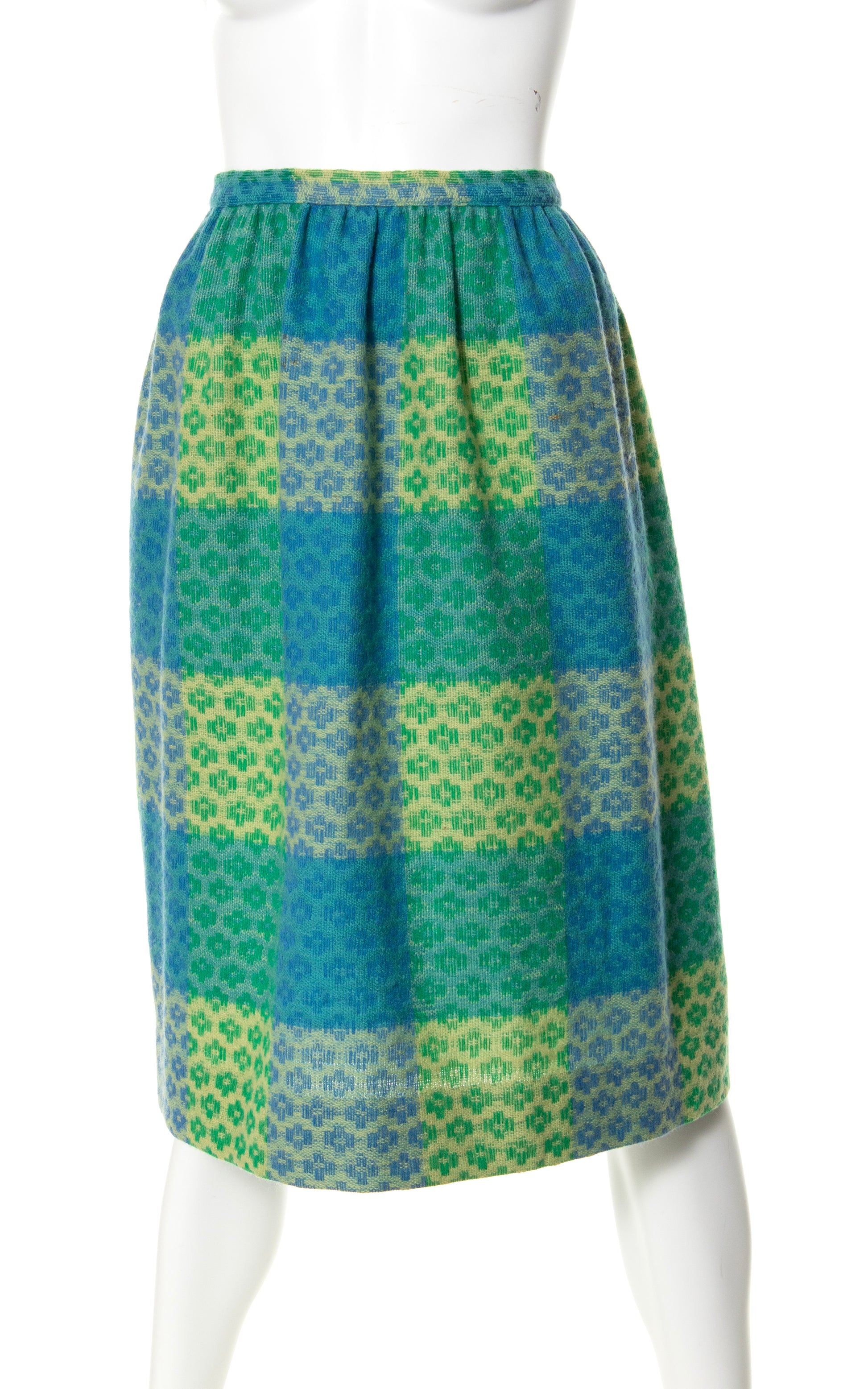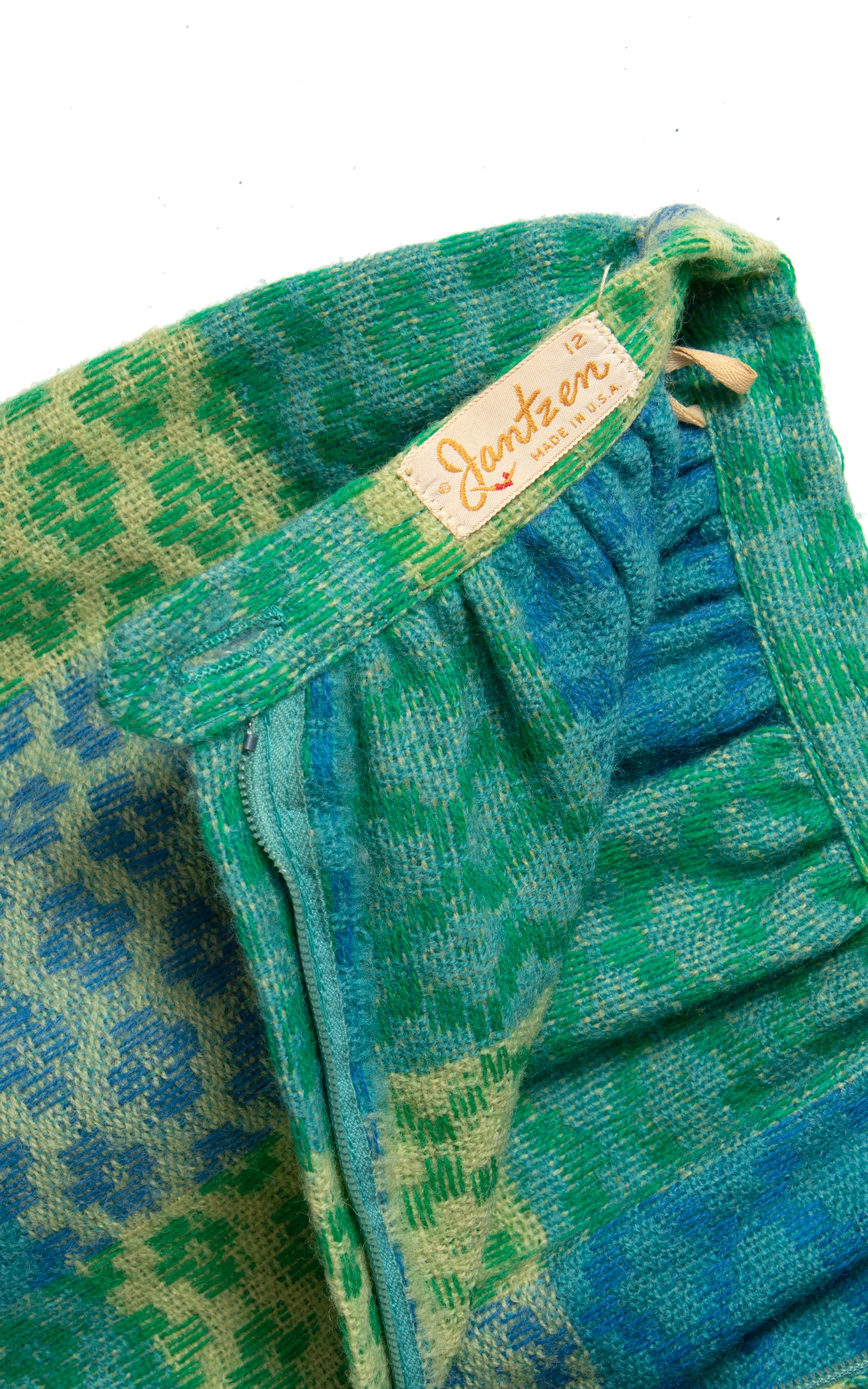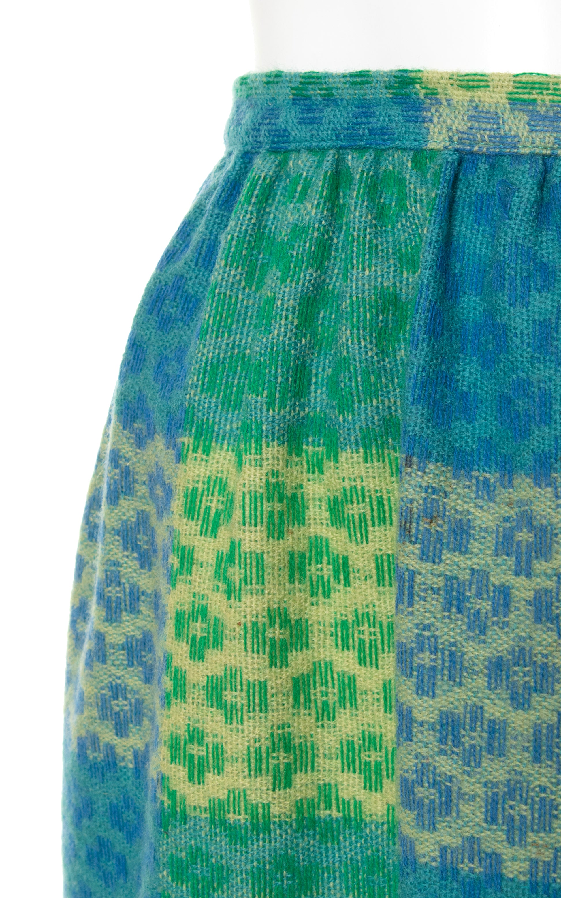 Very good vintage condition. Ready to wear! Three tiny light brown dots on front right side a few inches below waistband, one a few inches to the left of them, and another several inches down; they blend in with the busyness of the weave.